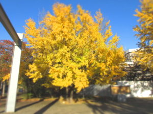 梅の湯から車で5分くらいの場所、キッセイホールのすぐ横に、いちょうの大木が何本もあります。いまちょうど紅葉がきれいで、黄色が鮮やかに生えております。
