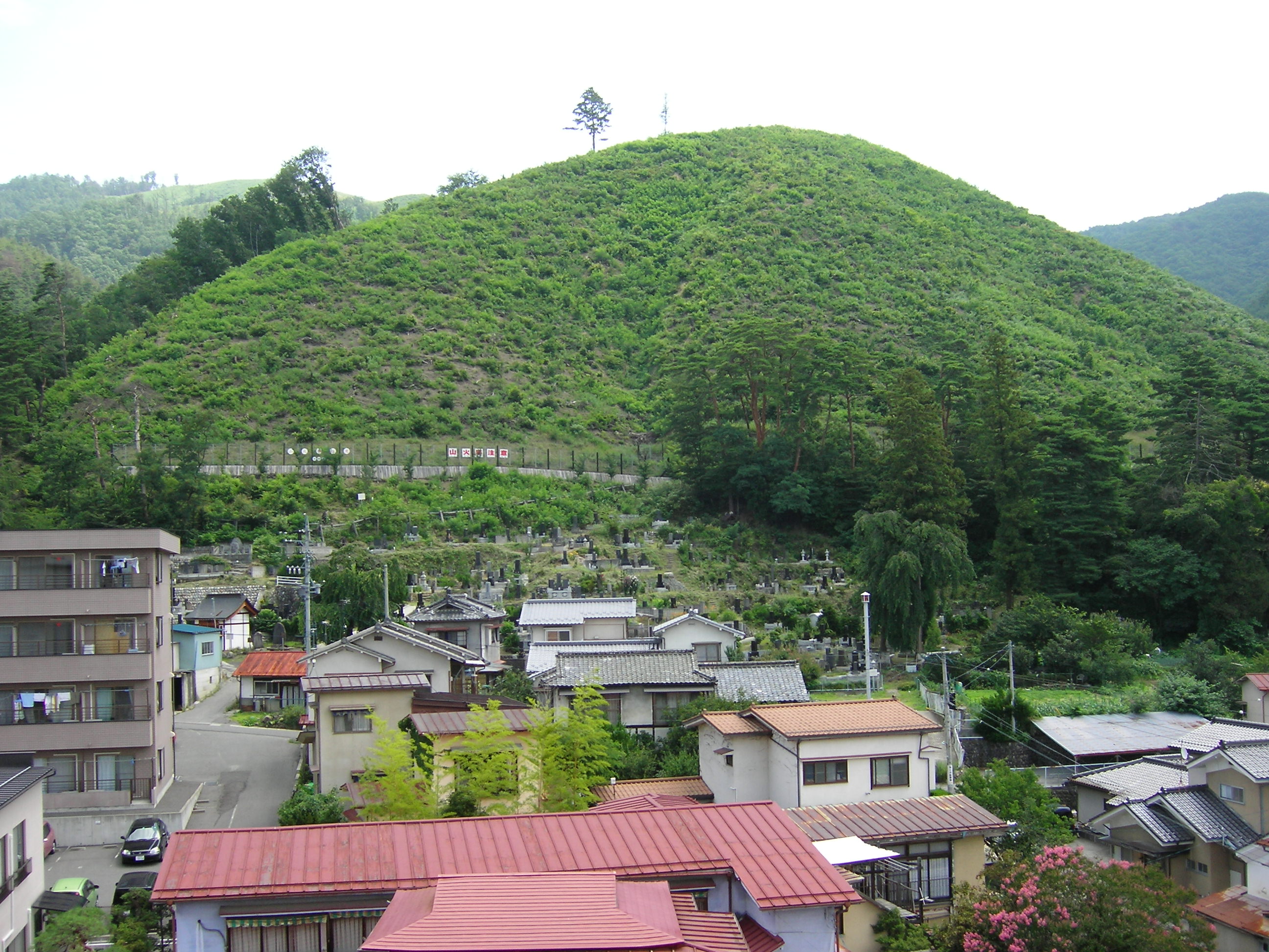 写真は梅の湯の屋上(屋上は係り以外は入れません)から東側を見たところです。山火事から3年たちますがこの山は急で土の少ない斜面なのでなかなか植林した木が育たなく、緑に見えるのはみなニセアカシアで大繁殖しております、このニセアカシアは根が浅く防災林にならず他の木の生長を妨げるので年に3回ほど伐採作業をしておりますがなかなかうまく駆逐できません。営林署や耕地林務課の方がたのお話だと後3年くらいはがんばらないと言っておられました。根気のいる山作りだと思います。