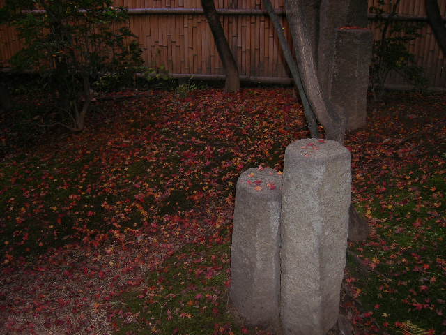 梅の湯のこけのある庭のもみじが紅葉してすぐに落ち始めました、その落ち葉がこけの上に敷きつめられたようになりとてもきれいです。