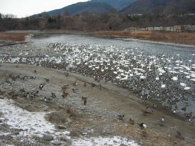 安曇野の白鳥 過去最高の飛来 カテゴリー: 梅の湯通信 2006年1月12日 梅の湯から車で15分の安曇野の白鳥の飛来が過去最高2000羽を越えたそうです、犀川白鳥湖、明科御宝田遊水地などで11日朝現在2023羽の白鳥を確認しました。白鳥が記録的な寒波と大雪で日本海の飛来地から南下したのではないかと思われます。ともかく北アルプス雪景色と白鳥の飛行がきれいに見えます。梅の湯にお泊りのお客様にも連日ご紹介し道案内しております。
