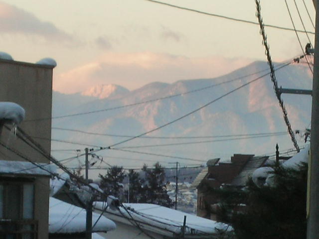 朝焼けの山 カテゴリー: 梅の湯通信 2007年1月10日 朝方、日の出から午前8時ころまで北アルプスが朝日が当たり赤く色づいて見える時があります。とても寒い朝ですがきれいな山の風景をみてますとすがすがしく、寒さをわすれます。 写真は梅の湯の玄関から見た昨日の朝7時ころの風景です。 梅の湯