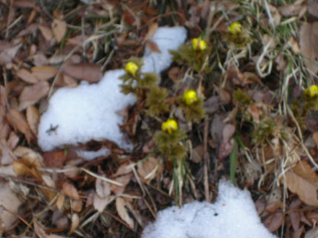 写真は昨年の福寿草祭りでの花です雪の間から花が見えました。
