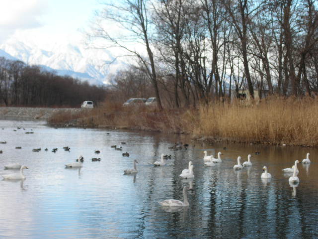 白鳥は日中は餌さを探しに池より飛び立っておりますので多くの白鳥が見れるのは明け方や夕方のほうが良いかも知れません。