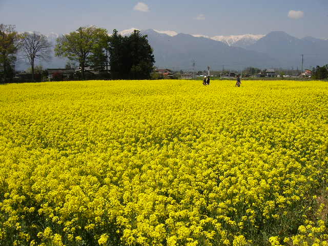 菜の花畑 カテゴリー: 松本平見どころ案内, 社長日記 2009年4月29日 梅の湯から車で20ほどの安曇野豊科にJAさんが栽培しております大きな菜の花畑があります。 ここの菜の花が満開でとてもきれいです。北アルプスと田園地帯と写真のようにとても素敵な風景です。 梅の湯