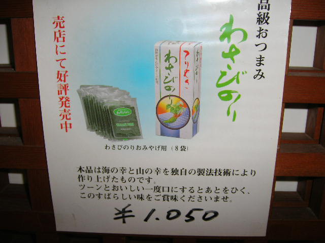 のりワサビ カテゴリー: 梅の湯通信 2009年7月8日 梅の湯の売店で「のりワサビ」の再販も始めました。 2年前まで梅の湯売店で販売しておりました。これもお客様のご要望販売再開いたしました。 前回と違い客室での試食はございませんが、売店での試食hできます。のりとわさびの味と香りがとても良いです。お菓子代りに、酒のつまみに最適です。 梅の湯