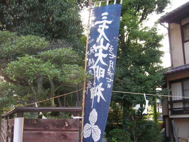 本日松明祭り カテゴリー: 松本平見どころ案内, イベント・祭り 2009年10月3日 朝からの雨が止みました。午後から提灯や旗の取り付けをしましたこの祭りの上り旗ですが(写真)、元禄3年の旗です。 梅の湯