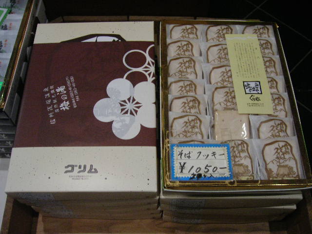 写真は「そばクッキー」です。浅間温泉にありますグリムさんの製品です。あまり甘くなく、硬くなく食べやすい、そしてそばの香りがいたします。このグリムさんのオーナーは筆者とはそば打ち仲間です。