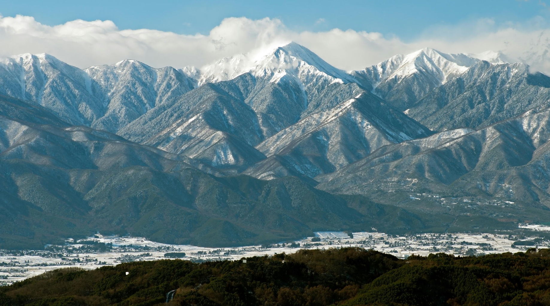 浅間温泉の裏山、大正山から見ました北アルプス常念岳を中心とした、山並みです。手前の山はアルプス公園、安曇野が綺麗に見えます。