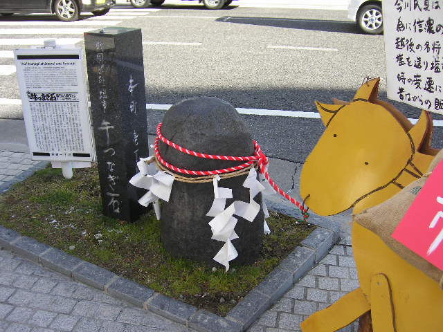 牛つなぎ石 カテゴリー: 松本平見どころ案内, 梅の湯通信 2011年1月21日 松本市の本町と伊勢町との角に「牛つなぎ石」があります、この石には戦国時代、信州への塩の物量を止められたときに、上杉謙信が信州に塩を送り、松本にも牛に背負われて塩がきました、その時の牛をつないだ石がこれです。 梅の湯